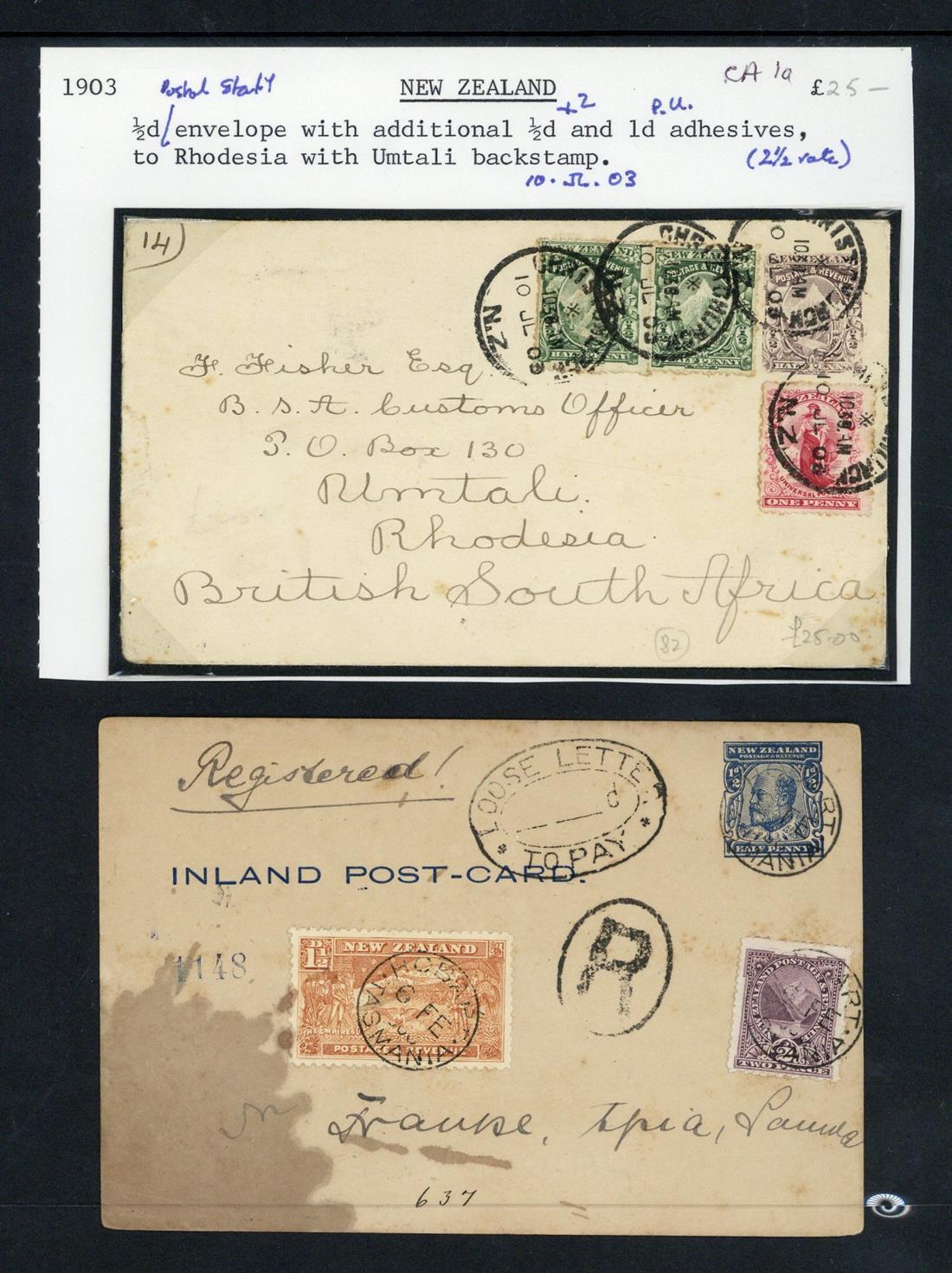 A used collection with ½d. small format (2, one to Belgium and one to Rhodesia) and large format (refolded), uprated with 8d., to Canada, 1d. large format, uprated with 1½d. and 8d., to Germany, and 2d. small format (7, six uprated with one to Belgium, one registered to Germany with 6d. and one to the Philippines); generally good to fine. Also 1908 ½d. blue card (stained corner), uprated with 1½d. and 2d., registered to Samoa with the stamps cancelled in transit at Hobart and showing double-oval "loose letter/ d/to pay" handstamp
