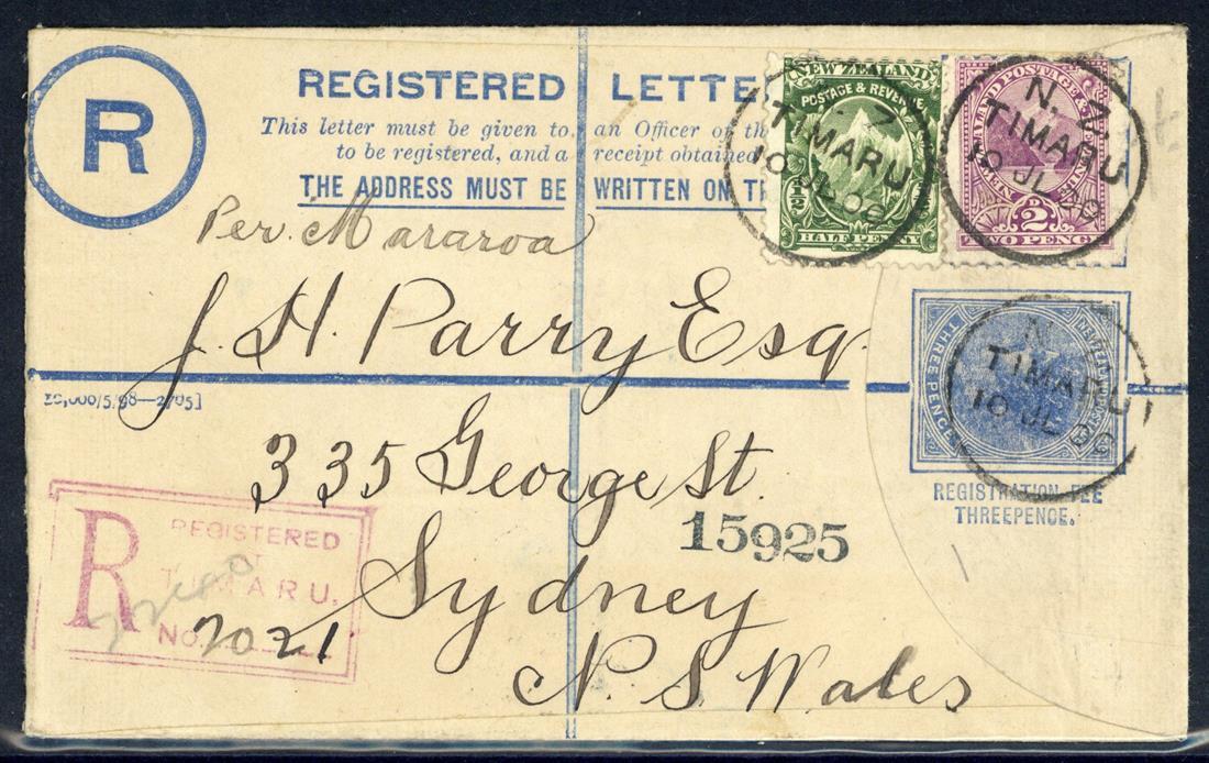 to australia: 1898 3d. size F, uprated with ½d. and 2d., from Timaru to Sydney, 1898 3d. size F, uprated with 2d. and Sideface 1d. (2) from Dunedin to Sydney and 1900 3d. size F, uprated with marginal 6d. showing part "arrow", posted at sea showing oval-framed "loose letter/ d/to pay" handstamp and with the stamps cancelled on arrival in Hobart (6.2.08)