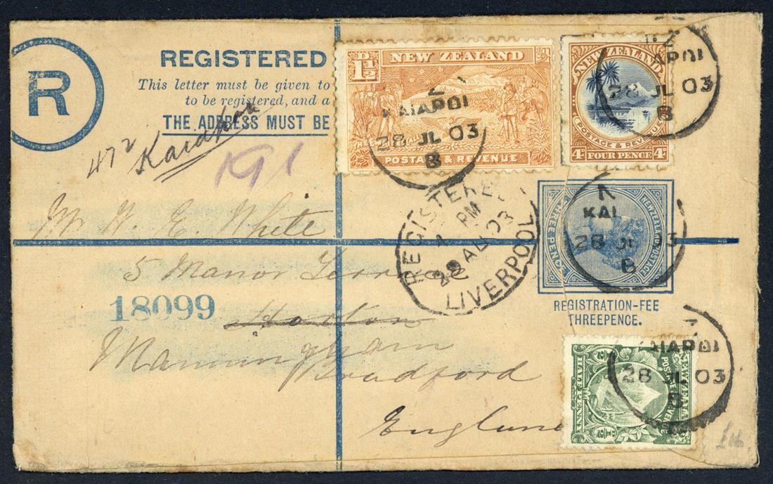 to united kingdom: 1884 without impressed stamp, size F franked with 2½d. and Postal Fiscal 8d. blue from Christchurch in 1898, 1898 3d. size G (4, one uprated with 6d. and 9d., one uprated with ½d. and 6d. rose (2) and one an attractive franking from Belfast), and 1900 3d. size F from Kaiapoi with manuscript registration mark