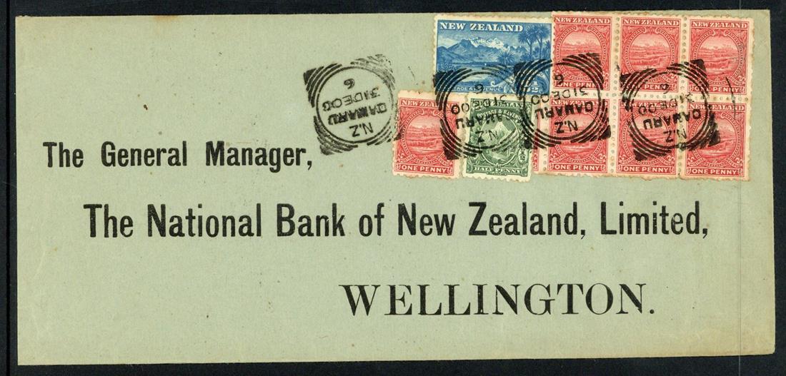 1900-05 selection of pre-printed Bank of New Zealand envelopes (10, 8 large) from a variety of offices with most addressed to Wellington, franked at 4d., 6d. (3), 8d. (3), 10d. (a colourful three-colour franking), 1/- and 1/0½d.