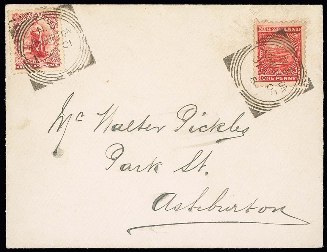 1901 (1 Jan.) envelope from Ashburton and addressed locally, bearing 1900 perf. 11 1d. cancelled with squared-circle datestamp of 31 December and 1d. Universal cancelled with similar datestamp for 1 January; an unusual last and first day cover for these 1d. values. Photo