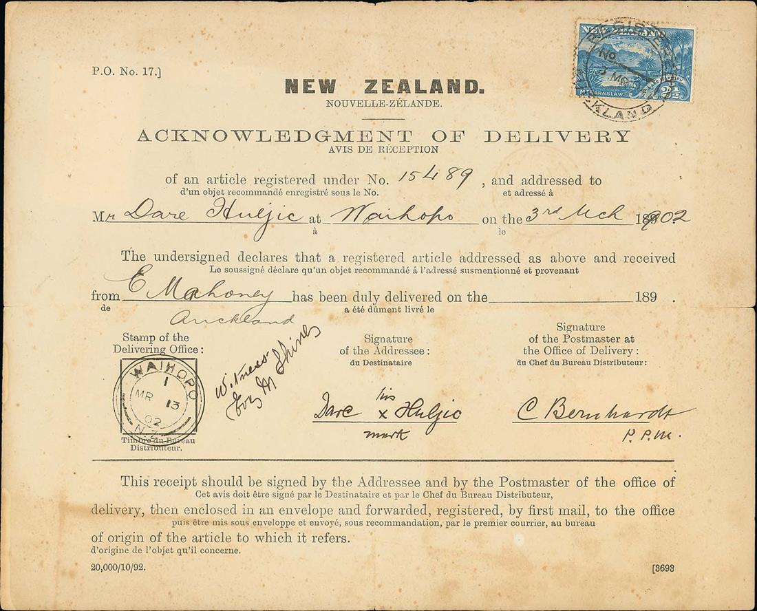 1902 (3 Mar.) Acknowledgement of Delivery form for a registered letter from Auckland to Waihopo, bearing 2½d. blue with Registered double-ring datestamp and with arrival c.d.s. at lower left; a couple of creases and a little stained though most unusual. Photo