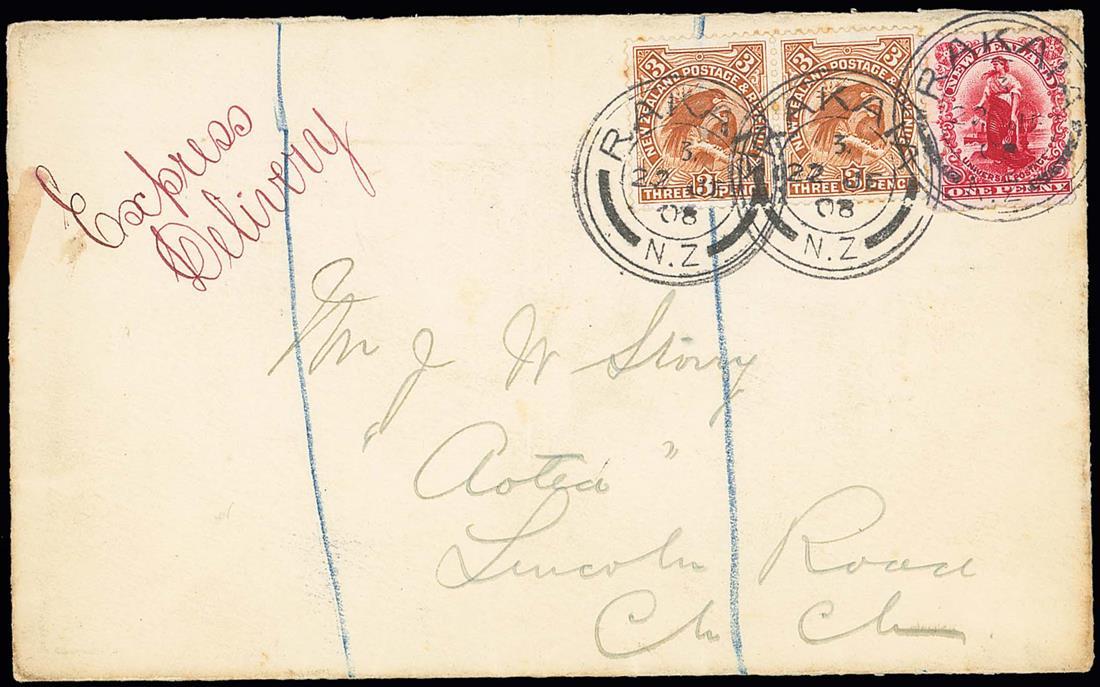 1908 (22 June) envelope registered from Rakaia to Christchurch, marked "Express Delivery" and bearing 1d. Universal and Pictorial 3d. pair neatly cancelled by c.d.s. and paying the Express Delivery fee, arrival c.d.s. on reverse; fine and scarce. Photo