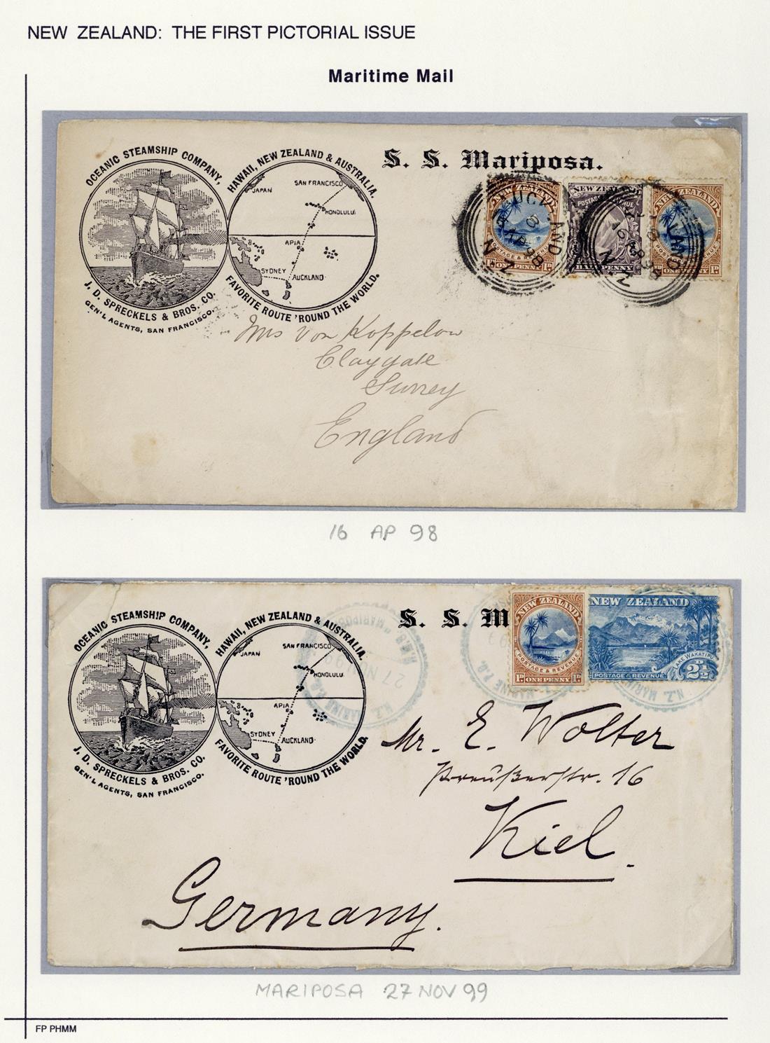 1898 S.S. Mariposa Oceanic Steamship Co. advertising envelope from Auckland to England bearing ½d. and 1d. (2) cancelled by datestamp, and 1899 (Nov.) similar envelope to Germany bearing 1d. and 2½d. cancelled by Marine Post Office Mariposa datestamp in light blue; the odd trace of soiling though an attractive pair. Diamond page 186