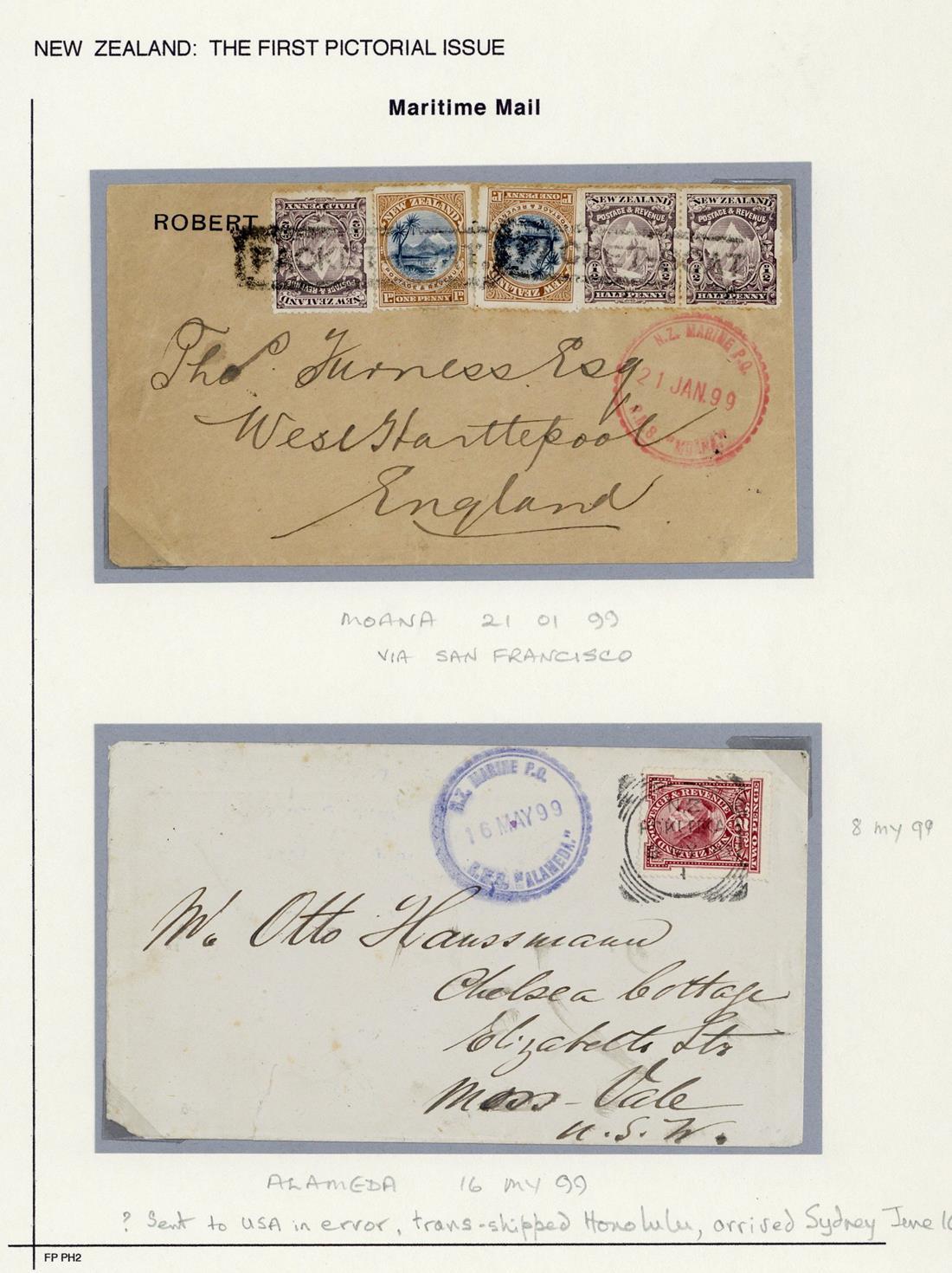 1899 envelopes to England (2, one creased) franked at 3½d. or 6d. cancelled by framed "packet-boat" and showing Marine Post Office Moana datestamp in red, 1899 envelope to U.S.A. bearing 2d. with Hokitika squared-circle datestamp and with Marine Post Office Alamedia datestamp in blue, 1904 postcard to England bearing 2d. and with marine Post Office Ventura datestamp in orange, and 1904 postcard from Wellington to Gibraltar showing "monowai" handstamp in violet and arrival datestamp