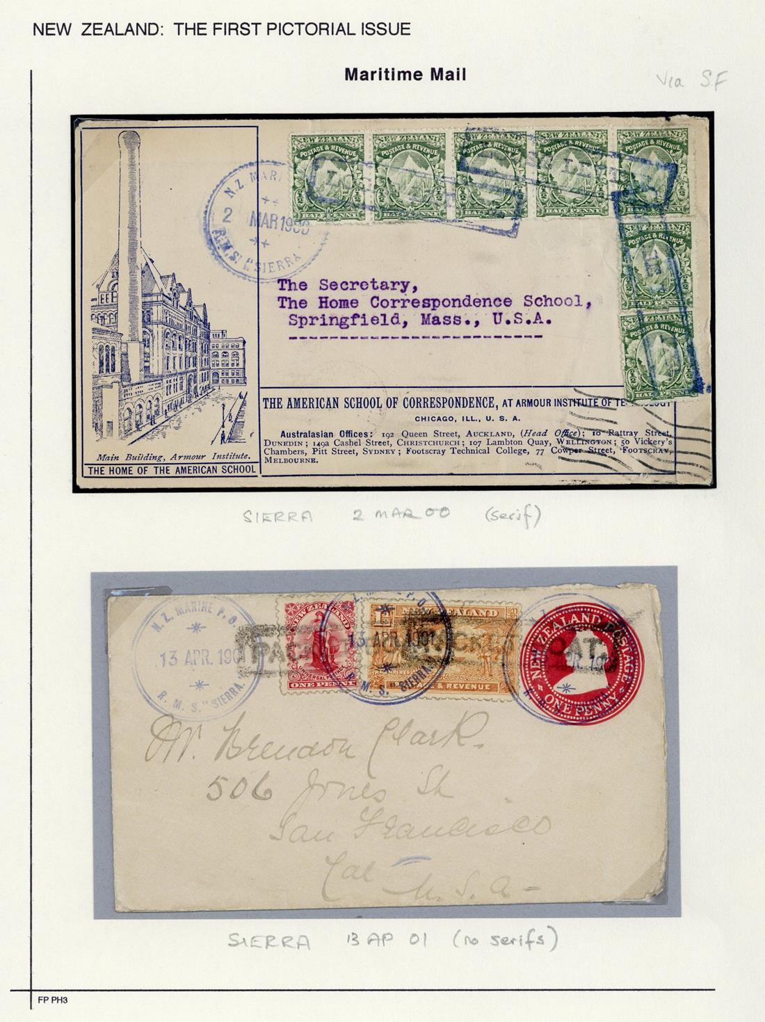 1900 American School of Correspondence advertising envelope to U.S.A. bearing ½d. (7) cancelled by framed "loose letter" handstamp and Marine Post Office Sierra datestamp, both in blue, and 1901 1d. envelope, uprated with 1½d. and 1d. Universal, to U.S.A., cancelled by framed "packet-boat" and by Marine Post Office Sierra datestamp in blue. An attractive pair