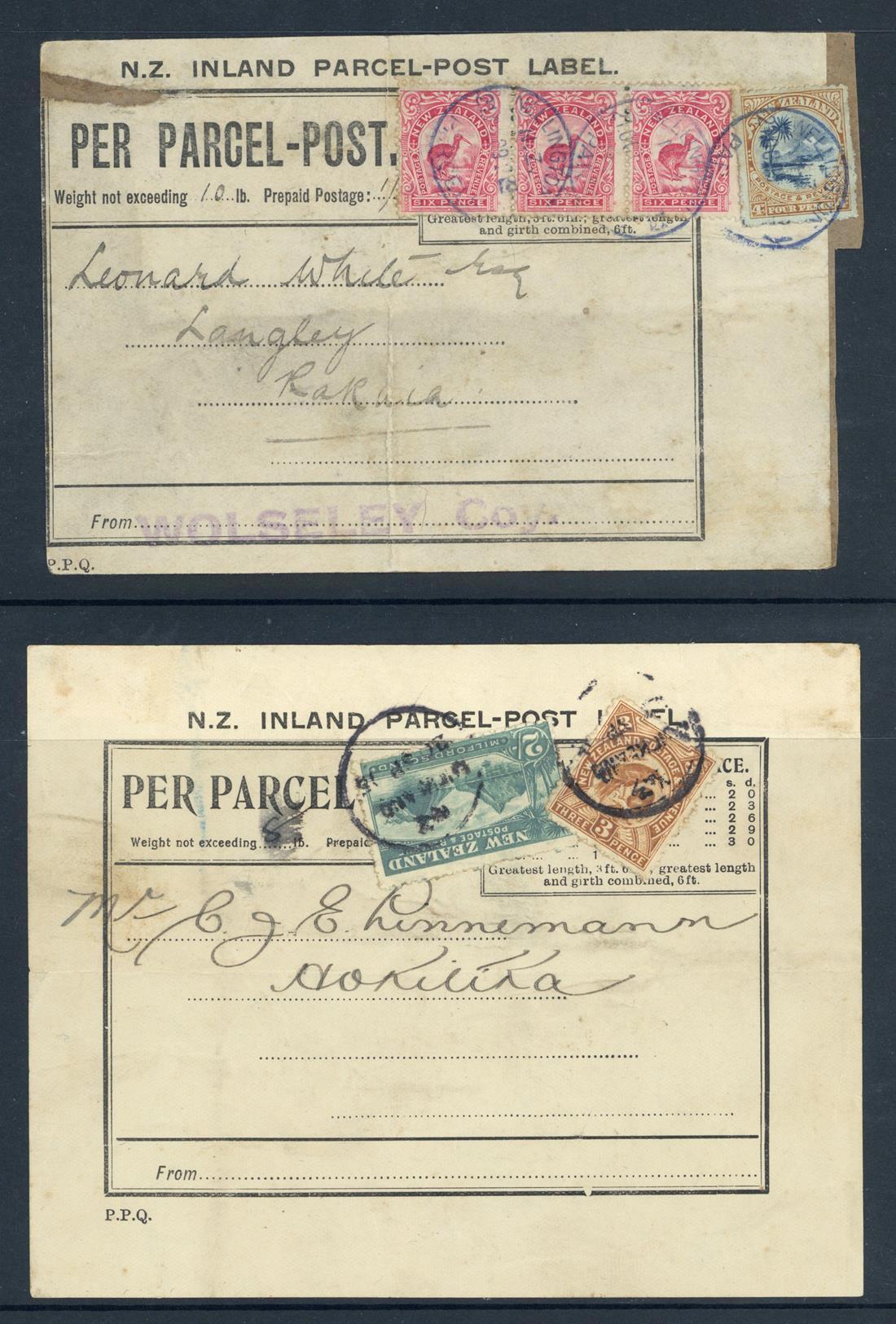 1915 white form (145x115mm.) from Auckland to Hokitika bearing 3d. and 2/- with c.d.s.; horizontal crest at centre, otherwise sound. Rare. Also 1909 white form from Wellington to Rakaia bearing 4d. and 6d. strip of three with parcel c.d.s. in violet; a little truncated and with small fault at upper left though scarce. Photo for first