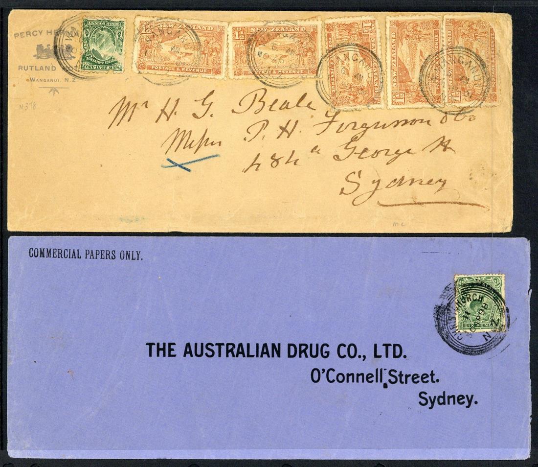 to australia: Collection (32) to Tasmania (all with the usual punctures), variously franked up to 7d. with a range of manuscript or handstamped registration markings, one using Government Life Insurance Department envelope, accompanied by a range of the Tattersall lottery tickets; also items to New South Wales (3) and Victoria (2). An interesting group