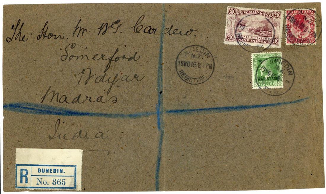 to other destinations: A selection at various rates and comprising items to Canada (3), India 92, one a large piece), Jamaica (opened-out and with New York Exchange registration label and a range of transit datestamps), New Caledonia and redirected to South Africa, and Venezuela (a quadruple rate with New York Exchange registration label). Generally fine and attractive group