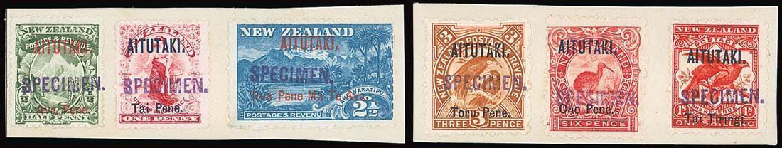 ½d. to 1/- set of six each handstamped "specimen." (NA2) in violet and affixed to two pieces; also ½d. and 6d. presentation stamps cancelled with parallel bars and 2½d. handstamped "ultramar" in violet. Photo