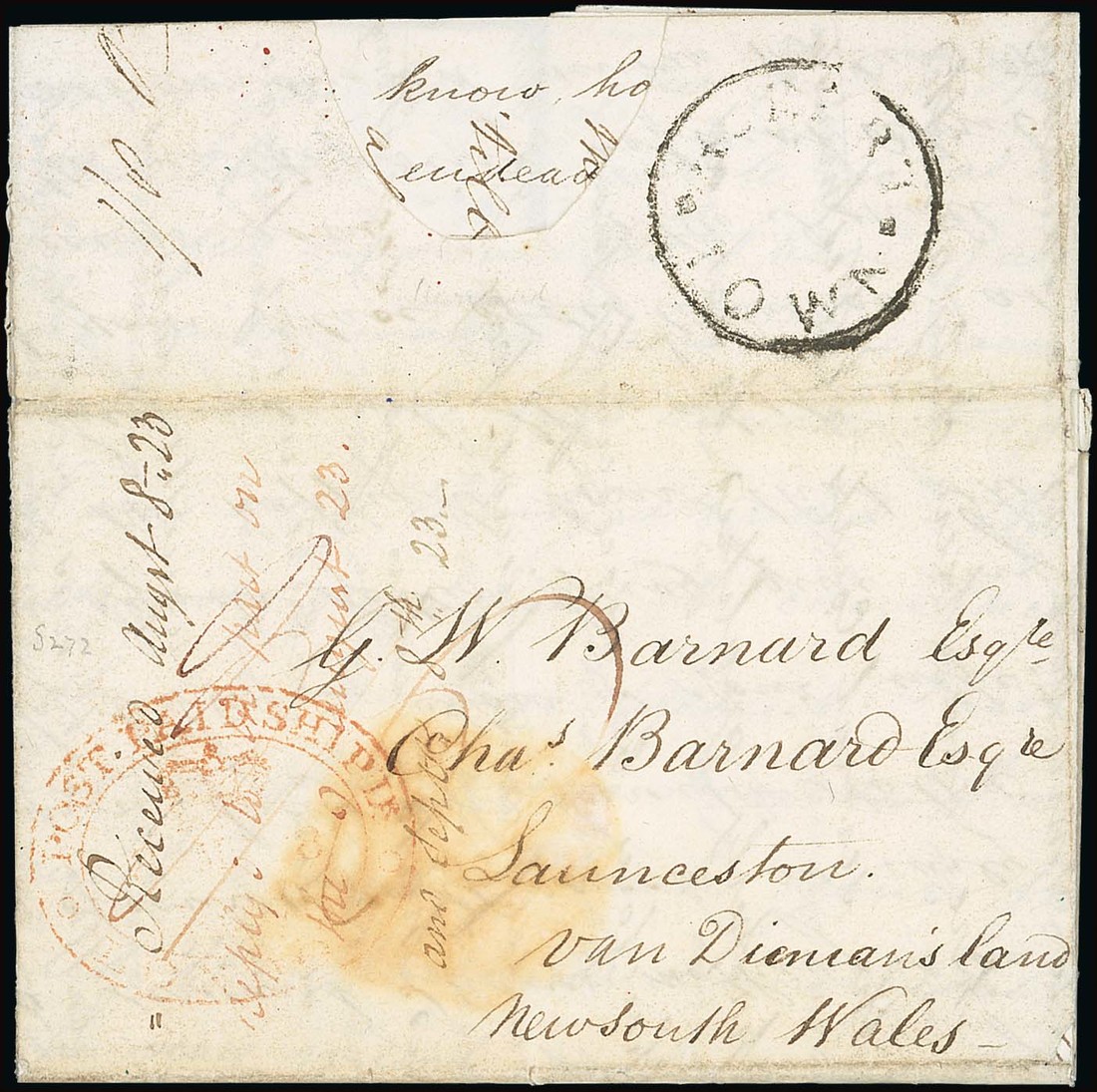 1823 (26 Feb.) entire letter from London to Launceston, rated "3/6" in red, showing "post paid ship ltr/london" double-lined oval d.s. in red and, on reverse, a good to fine strike of "hobart/town" circular handstamp; the face panel with light stain and recipient's notation at left; also 1823 (20 Apr.) entire letter from London to Hobart without postal markings. Photo