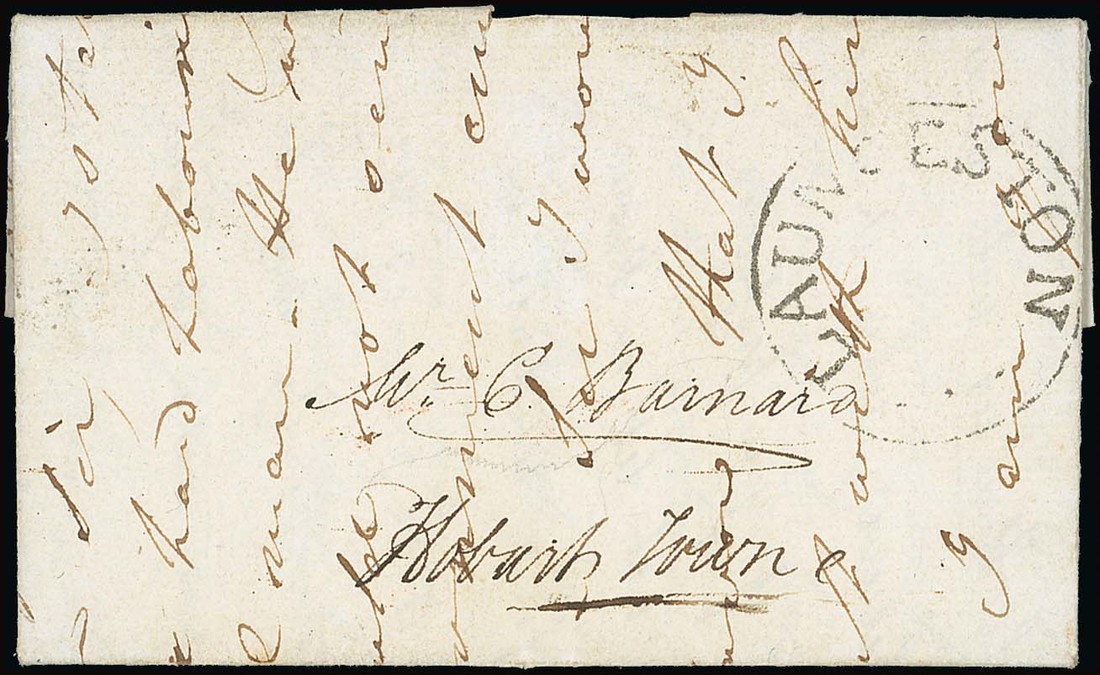 1822 (16 Dec.) entire letter to Hobart showing mainly fine "launceston" circular handstamp; the entire has subsequently been re-used on 4 January 1823 when carried by hand from Hobart to Launceston with letter written across the face panel. Most unusual. Photo