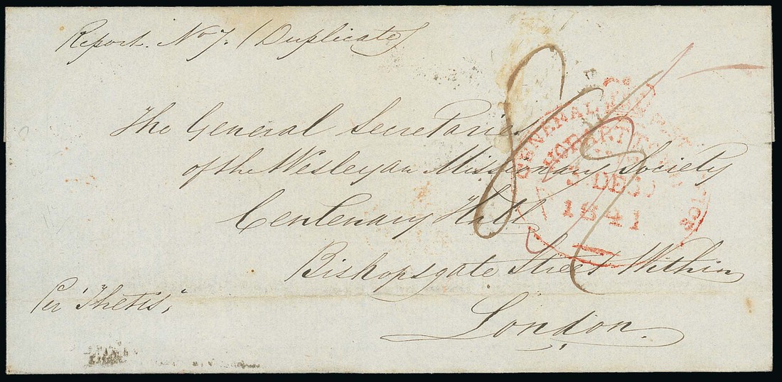 1841 (3 Dec.) missionary entire to London, marked "Per Thetis", variously rated, showing good to fine Crowned "general post office/hobart town/vdl" oval d.s. in red with, on reverse, unframed "ship letter" and red arrival c.d.s. (28.6). Photo