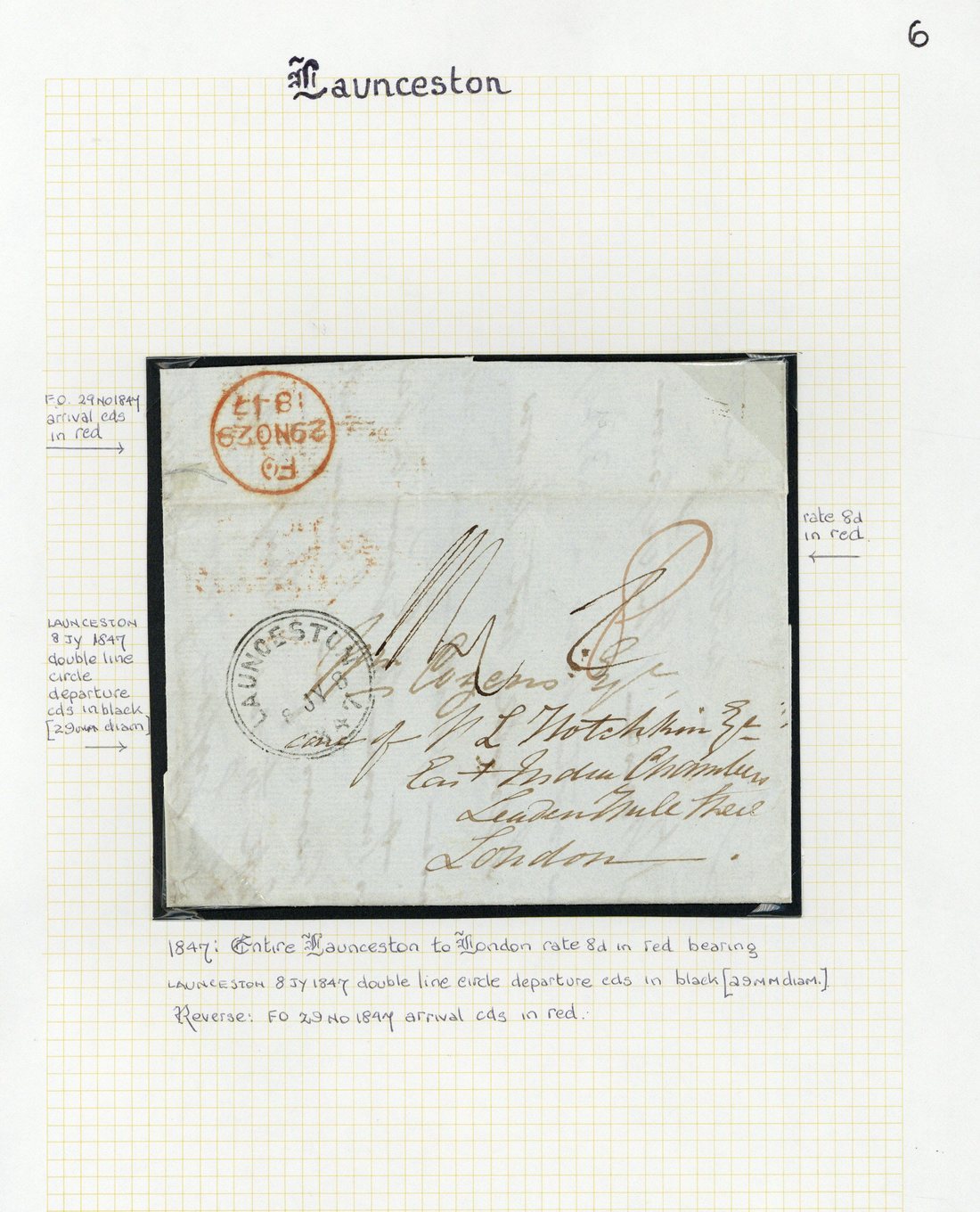 1847 (8 July) entire letter from Launceston to London, rated "8" in red (deleted) and "1/4", showing fine "launceston" double-ring c.d.s. with red arrival d.s. (29.11) on reverse