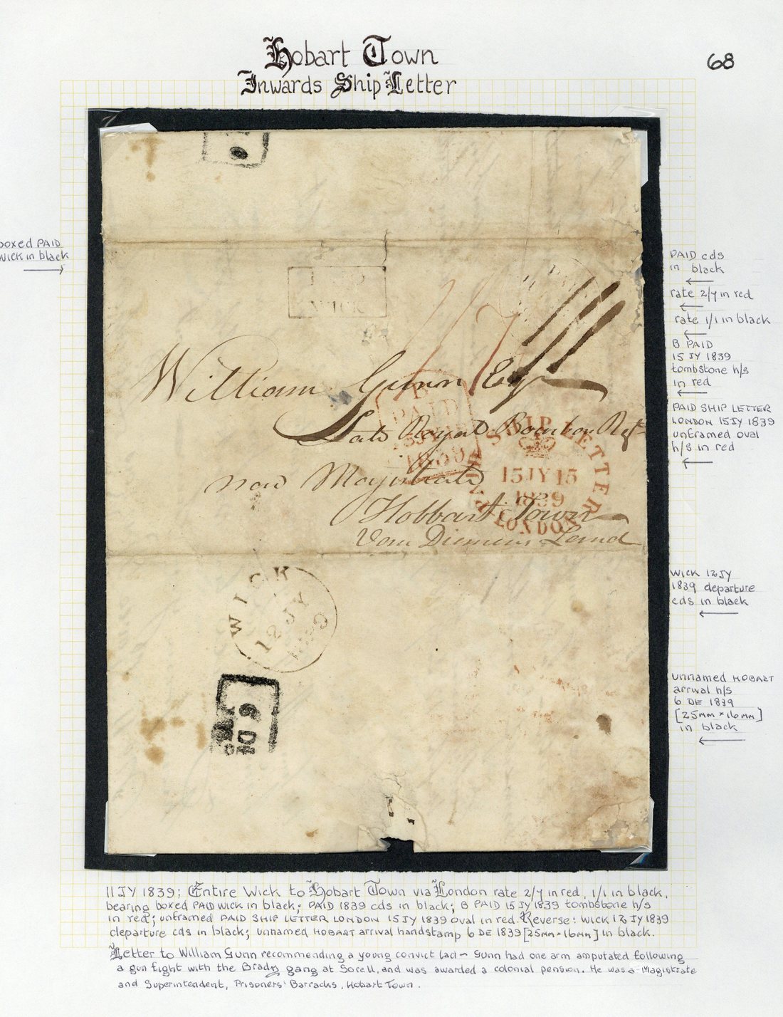1839 (11 July) entire letter from Wick to Hobart, rated "1/7" in red and "1/1", showing red London "paid" d.s. and "paid ship letter/london" oval d.s. and, on reverse, despatch c.d.s. and arrival un-named datestamp (Type C2) dated 6th December; 1841 (2 Apr.) entire (creased) from Hobart to Pittwater, rated "3" and showing, on reverse, fine Hobart un-named c.d.s. (Type C1b); 1848 (7 Nov.) entire letter (damaged) from Hobart to Sorell, rated "4" and showing, on reverse, almost complete Hobart un-named c.d.s. (Type C1b); and 1850 (15 May) entire from Hobart to Launceston, rated "4" and showing, on reverse, Hobart un-named c.d.s. (Type C1b) and Launceston single-ring arrival d.s.
