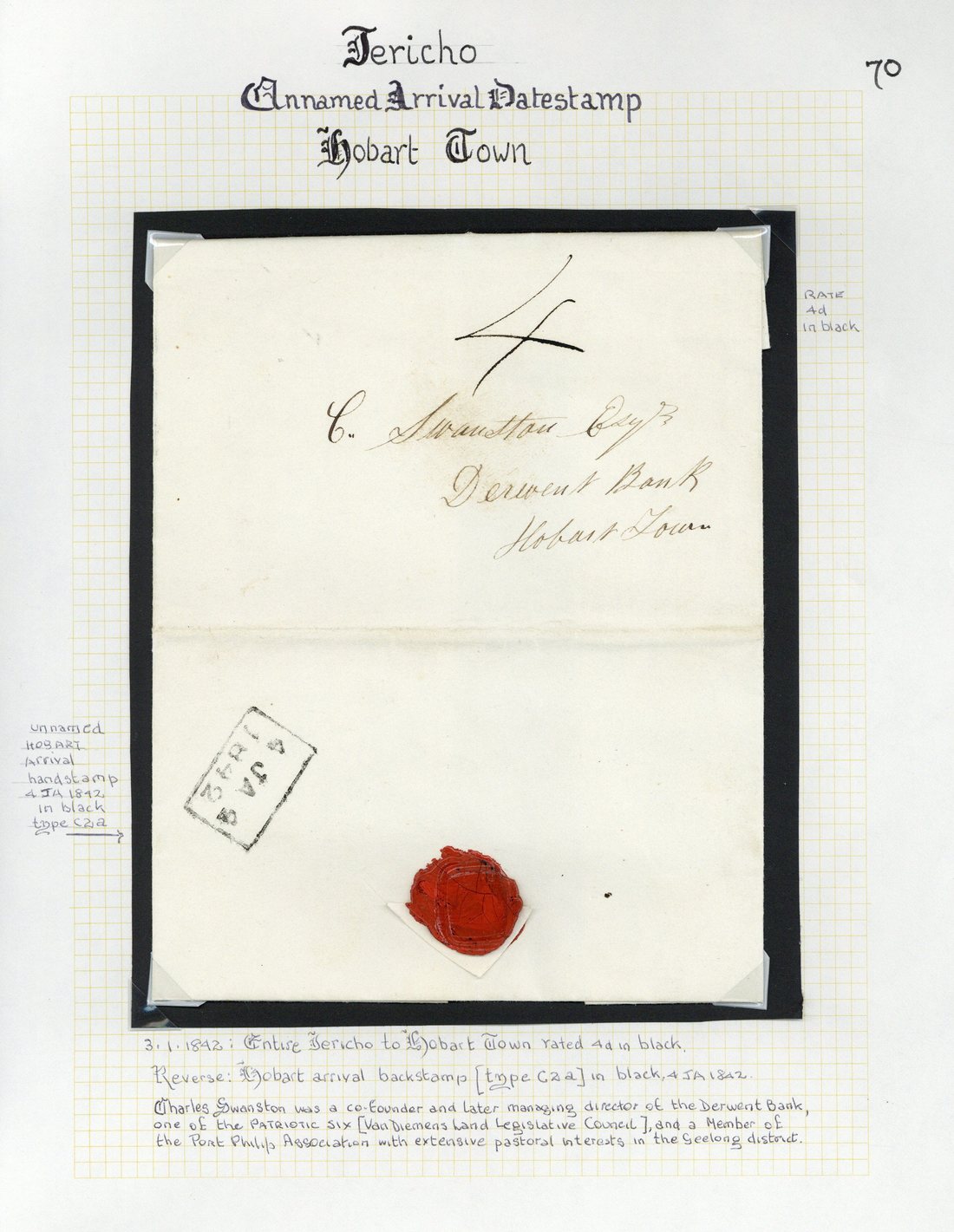 1842 (3 Jan.) entire from Jericho, 1843 (11 Jan.) entire from Port Arthur and 1846 (18 Sept.) entire letter from Launceston, all addressed to Hobart, all rated "4" and showing un-named framed arrival d.s. (Type C2a); also 1852 (24 Feb.) entire letter (faults) from Launceston to Pittwater, rated "4", showing Launceston single-ring despatch datestamp and, on reverse, Hobart un-named c.d.s. (Type C1b)