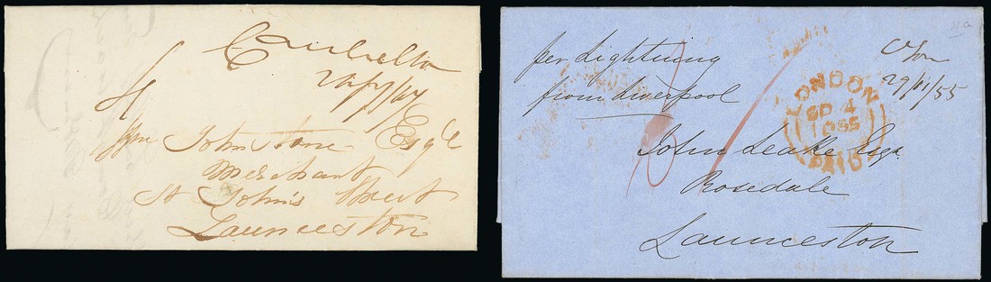 1847 (24 July) entire to Launceston, rated "4", showing manuscript "Campbelltown, 24/7/47" with arrival c.d.s. on reverse; 1855 (3 Sept.) entire letter from London to Launceston, marked "per Lightning from Liverpool", rated "6" and "1" in red, showing despatch c.d.s. in red with manuscript "CTown, 29/11/55" alongside and, on reverse, diamond-shaped "ship letter inwards free" d.s. (29.11). An interesting pair. Photo