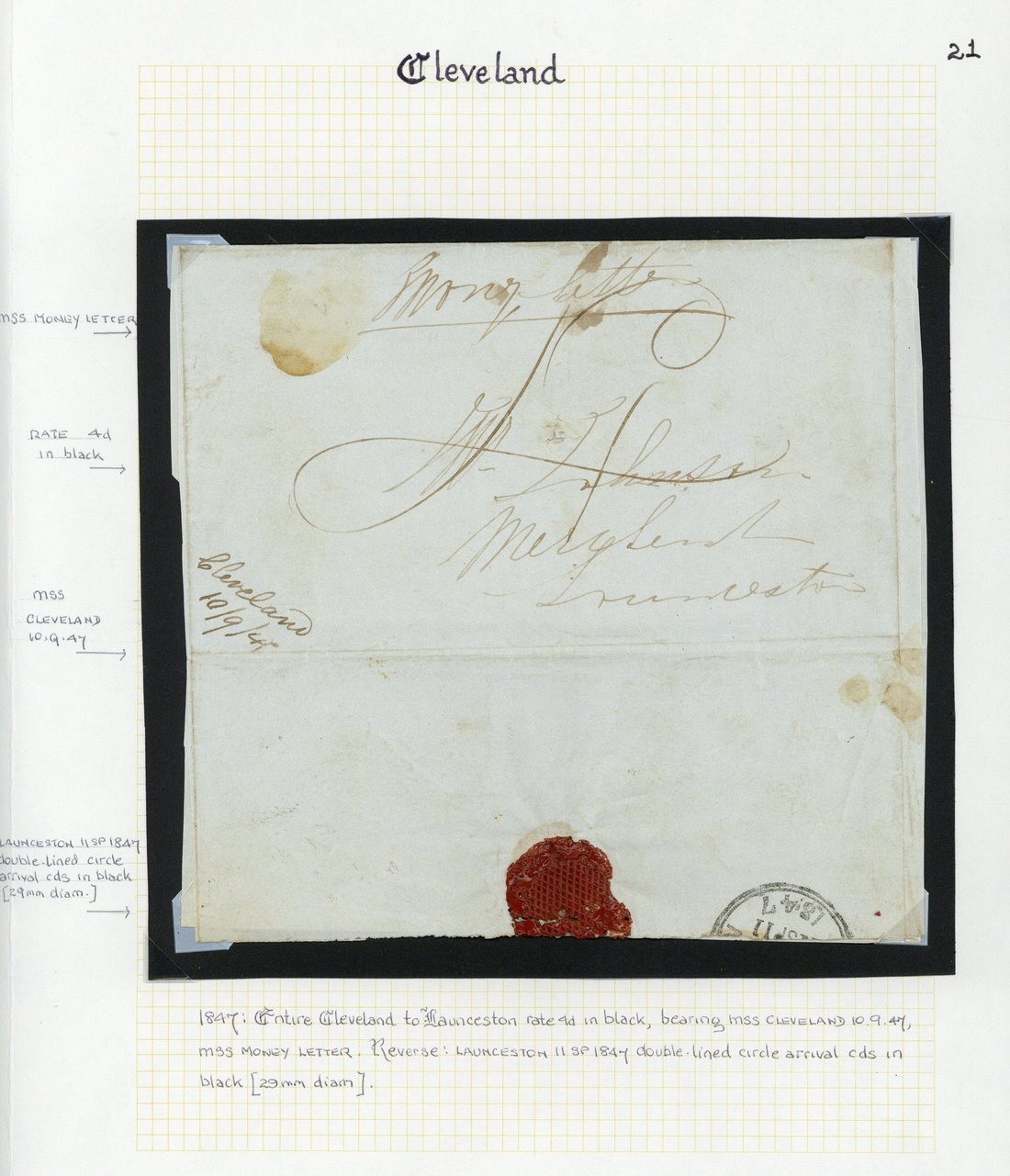 1847 (Sept.) entire (central spike hole and a little soiled) to Launceston, marked "Money Letter", rated "4", showing manuscript "Cleveland, 10/9/47" with arrival c.d.s. on reverse; 1848 (Dec.) entire letter (repaired spike hole) to Launceston, rated "4", showing manuscript "Clevd 29/12/48" with arrival c.d.s. on reverse