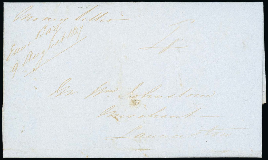 1847 (Aug.) entire letter (central spike hole) to Launceston, marked "Money Letter", rated "4" showing manuscript "Emu Bay, 9 August 1847" with arrival c.d.s. on reverse. Photo
