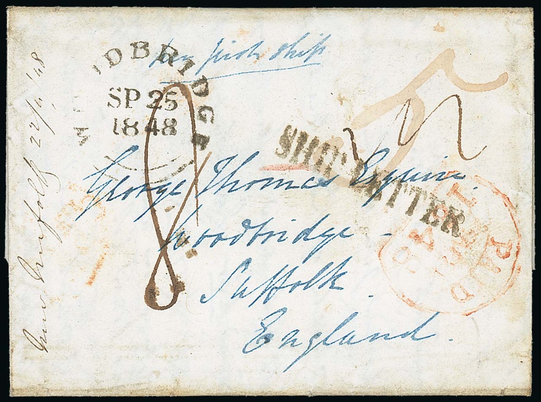 1848 (Apr.) entire letter to Suffolk, rated "5" in red (deleted) and "8", showing manuscript "New Norfolk 27/4/48", Hobart "paid" d.s. in red, unframed "ship letter" and Woodbridge arrival c.d.s. (25.9). Photo