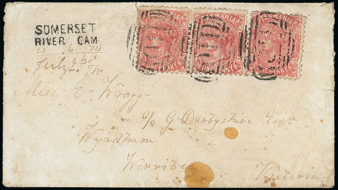 1874 envelope to Victoria, bearing Sideface 1d. pair and single, each cancelled "110" and showing unframed "somerset/river cam" h.s. with manuscript date "4.6.74" below and, on reverse, Launceston diamond d.s. in red and Melbourne arrival c.d.s.; the envelope slightly soiled and with two small stains. Rare. Photo