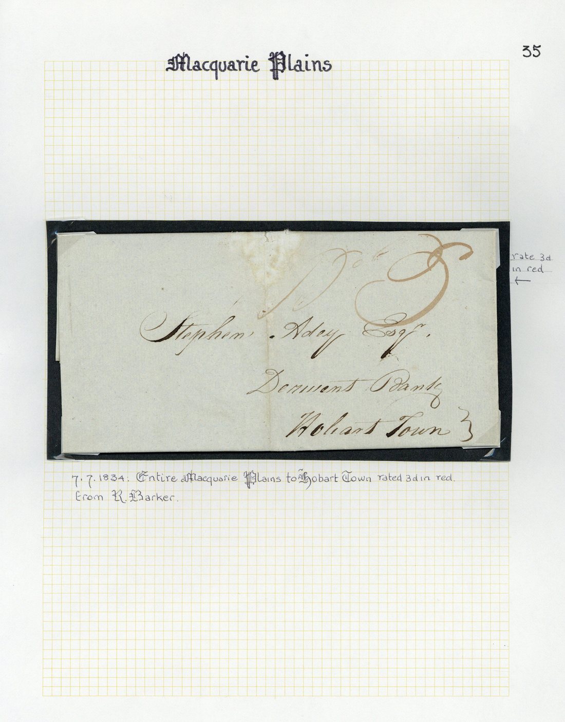 1834 (7 July) entire letter from Macquarie Plains to Hobart rated "3d" in red; 1834 (11 July) entire letter from High Plains to Hobart rated "4"; 1834 (14 July) entire letter from New Norfolk to Hobart rated "3"; 1834 (21 July) entire letter from Campbell Town to Hobart rated "6" in red; 1834 (24 July) entire letter from Rendlecham to Hobart rated "6"; 1842 (17 Mar.) entire letter from Launceston to Macquarie River rated "4"; 1843 (16 Aug.) and (13 Nov.) entire letters from Broadmarsh to Launceston rated "4" in red; and 1845 (2 Oct.) entire letter from Launceston to Broadmarsh rated "4" in red. A good lot