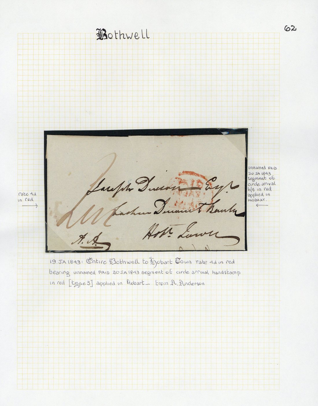 1843 (19 Jan.) entire letter from Bothwell to Hobart, rated "4" in red and showing inward red "paid" d.s. (Type 26); 1843 (23 Jan.) entire from Oatlands to Hobart, rated "1/-" and showing inward red "paid" d.s. (Type 26), both fair to good strikes; 1853 (4 May) entire letter from Hobart to Launceston, showing fair despatch "paid" d.s. in red (Type 24) with arrival c.d.s. on reverse; also a part entire letter from Green Ponds to Richmond, rated "6" in red and red "paid" d.s. (Type 25) of Hobart