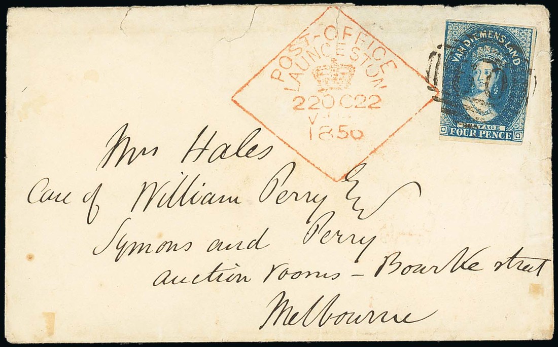 1856 (22 Oct.) envelope to Melbourne, bearing 1856-57 4d. blue (touched at sides) tied by "60" obliterator and showing diamond shaped "post office/launceston" d.s. in red alongside with, on reverse, "ship letter/free/g.p.o. victoria" d.s.; the envelope with part flap missing. Photo