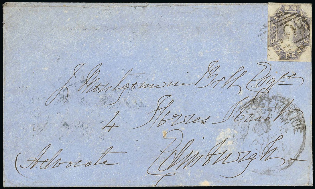 1859 (Jan.) envelope to Edinburgh, bearing 1858 6d. dull lilac with close to good margins, tied by "62" obliterator, showing "general post office/hobart town" c.d.s. in black with arrival d.s. (1.4); the envelope with some minor age spotting. Photo