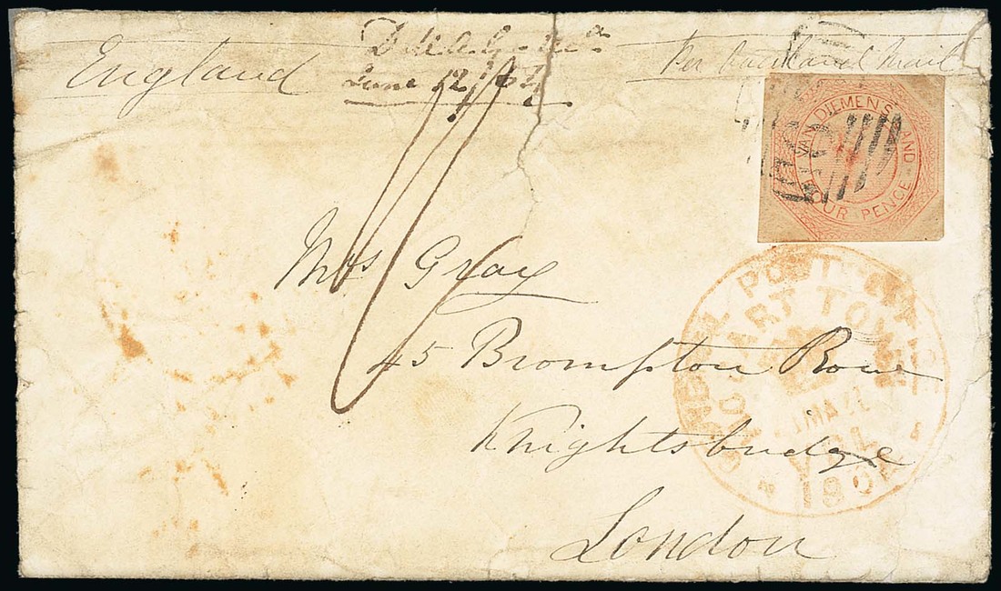 1854 (21 Mar.) envelope (faults) to London, bearing 1853 Courier 4d. (stained) tied by typically light "63" obliterator, showing manuscript "1/-", "general post office/hobart town" c.d.s. in red with arrival d.s. on reverse; some faults. Photo