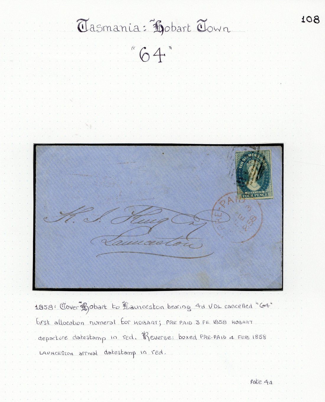 1858 (3 Feb.) and 1859 (24 Mar.) envelope and entire (no side flaps) to Launceston bearing 1857-67 4d. blue, both tied by just legible "64" obliterator and showing despatch and arrival (on reverse) "pre-paid" d.s. in red