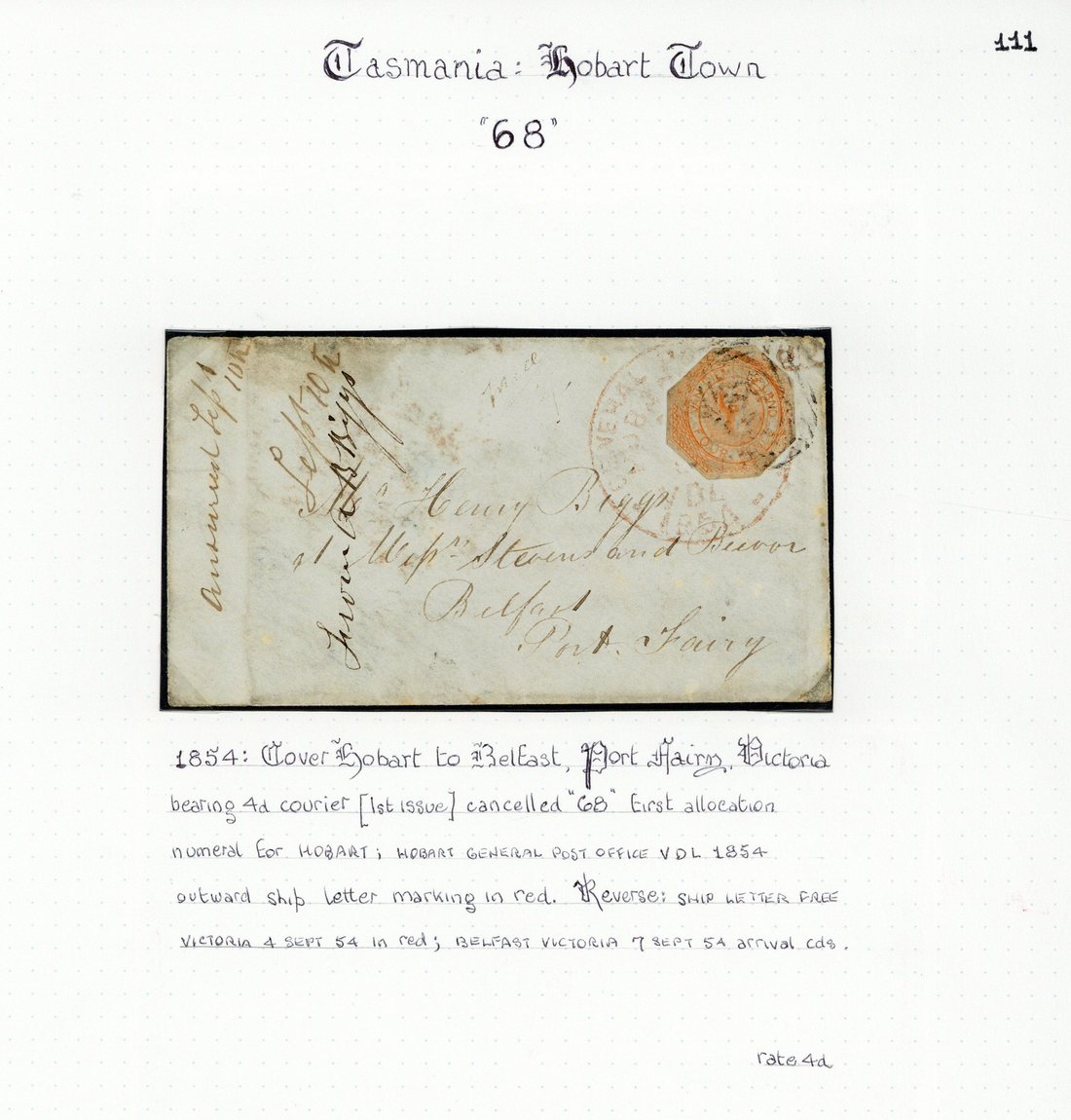 1854 (28 Mar.) front to Green Ponds, bearing 1853 Courier 4d. (cut to shape); 1854 (11 Apr.) envelope to Brighton, bearing 1853 Courier 4d. (cut to shape) and showing "paid" oval d.s. in red; and 1854 (Sept.) envelope to Port Fairy, bearing 1853 Courier 4d. (cut to shape) additionally tied by "general post office/hobart town" c.d.s. in red.. Condition very mixed