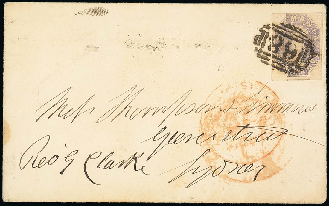1859 envelope to Sydney, bearing 1858 6d. with just clear to good margins, clearly tied by "68" obliterator, showing two poor strikes of "general post office/hobart town" c.d.s. in red with "ship-letter/sydney" c.d.s. (25.4) on reverse. Photo