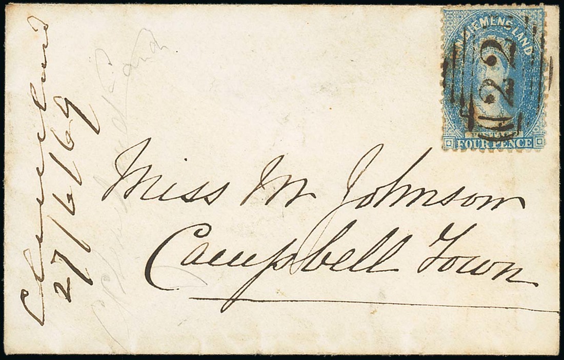 1869 (June) envelope to Campbell Town, bearing 1864-69 perf 12 4d. pale blue, centrally cancelled by very fine "22" obliterator and showing manuscript "Cleveland, 27/6/69" at left. Photo