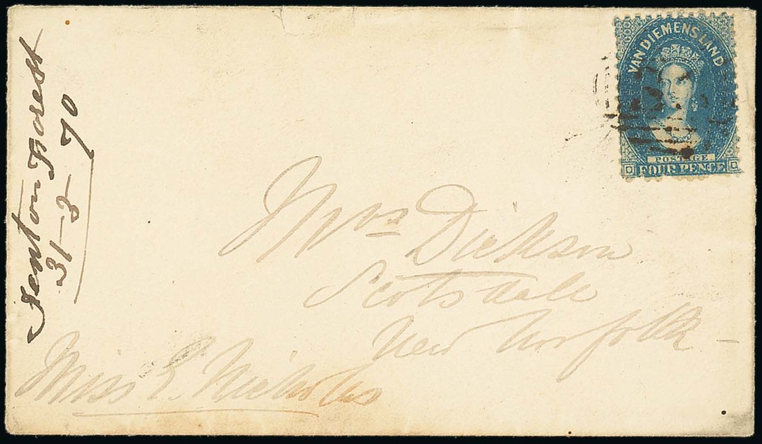 1870 (Mar.) envelope to New Norfolk, bearing 1864-69 perf 10 4d. blue with re-entry, tied by "33" obliterator and showing manuscript "Fenton Forest, 31-3-70" at left. Photo