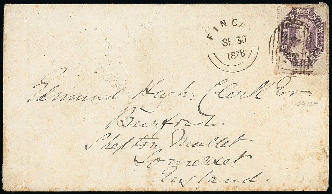 1879 (30 Sept.) envelope to England, bearing 1878 perf 11½ 6d. bright violet tied by "34" obliterator and showing "fingal" c.d.s. alongside and, on reverse, Launceston (1.10) and arrival (25.11) datestamps; some minor creases and fox marks. Photo