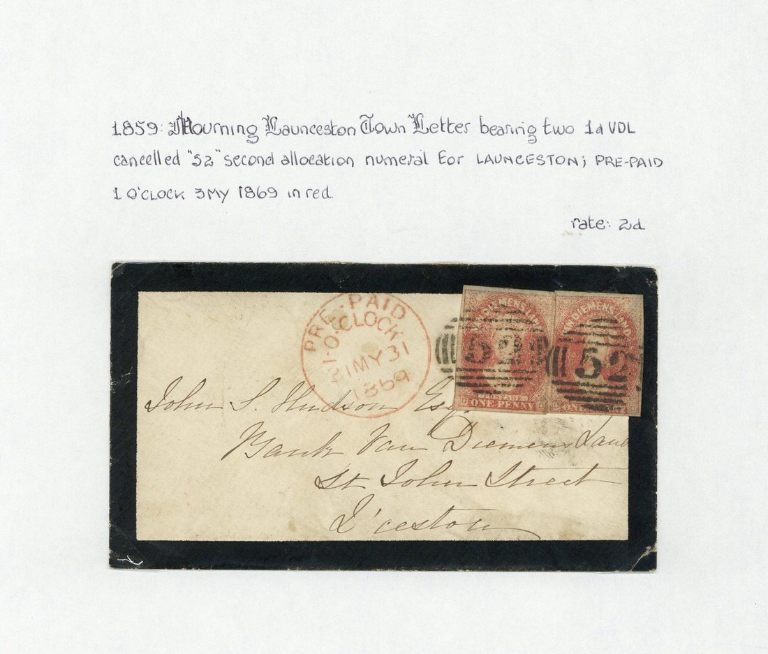 1869 (31 May) locally addressed mourning envelope bearing 1857-67 1d. dull vermilion (2) tied by "52" obliterator and showing "pre paid/1 o clock" c.d.s. in red alongside; and 1873 (15 Dec.) locally addressed circular bearing Sideface 1d. clearly cancelled "52" and showing "pre paid/10 o clock" c.d.s. in red