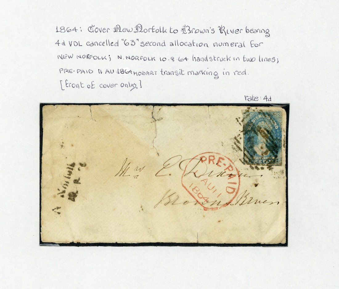 1864 (Aug.) front to Brown's River bearing 1857-67 4d. blue (cut into) tied by "63" obliterator, showing "N Norfolk/10.8.64" d.s. at left and Hobart "pre-paid" transit d.s. in red; 1866 and 1867 envelopes ex the same correspondence to Hobart, bearing 1864-69 perf 10 4d. blue, centrally cancelled "63", showing trace of New Norfolk datestamp and red "pre-paid" arrival d.s. All with faults