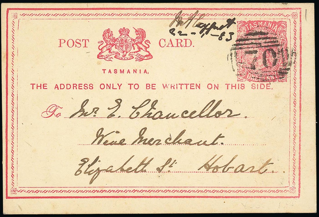 1883 (Jan.) 1d. stationery card to Hobart, cancelled by "70" obliterator and showing manuscript "Port Cygnet 22-1-83" alongside with arrival c.d.s. on reverse, fine. Photo