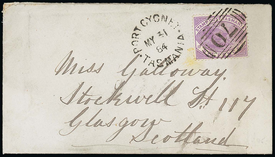 1884 (31 May) envelope to Glasgow, bearing Postal Fiscal 1880 6d. mauve crisply tied by superb "70" obliterator, showing "port cygnet/tasmania" c.d.s. alongside with, on reverse, Hobart and arrival datestamps. Photo