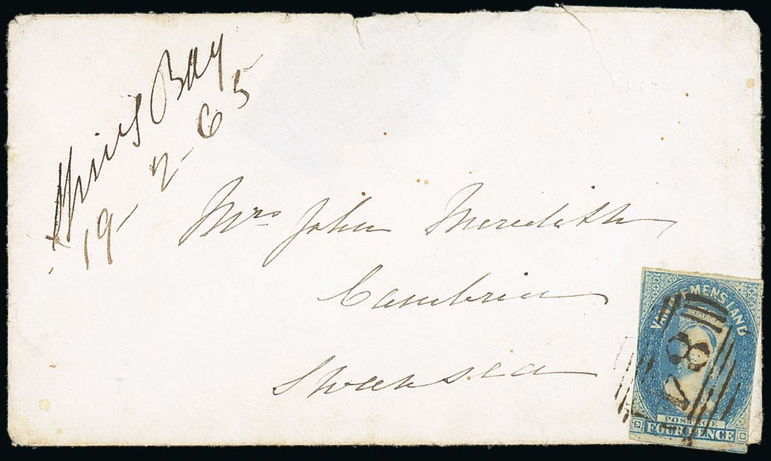 1865 (Feb.) envelope to Swansea, bearing 1857-67 4d. blue (cut into), neatly tied by "84" obliterator and showing manuscript "Spring Bay, 19-2-65" at upper left; the envelope with flap missing. Photo
