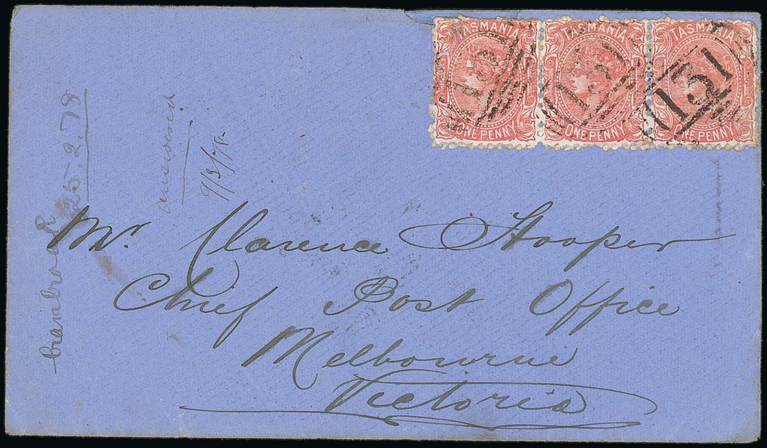 1878 (Feb.) envelope to Melbourne, bearing Sideface 1d. (3), each cancelled by "131" obliterator, showing manuscript "Cranbrook, 25-2-78" at left with, on reverse, Launceston and arrival datestamps; the envelope with part of flap missing. Photo