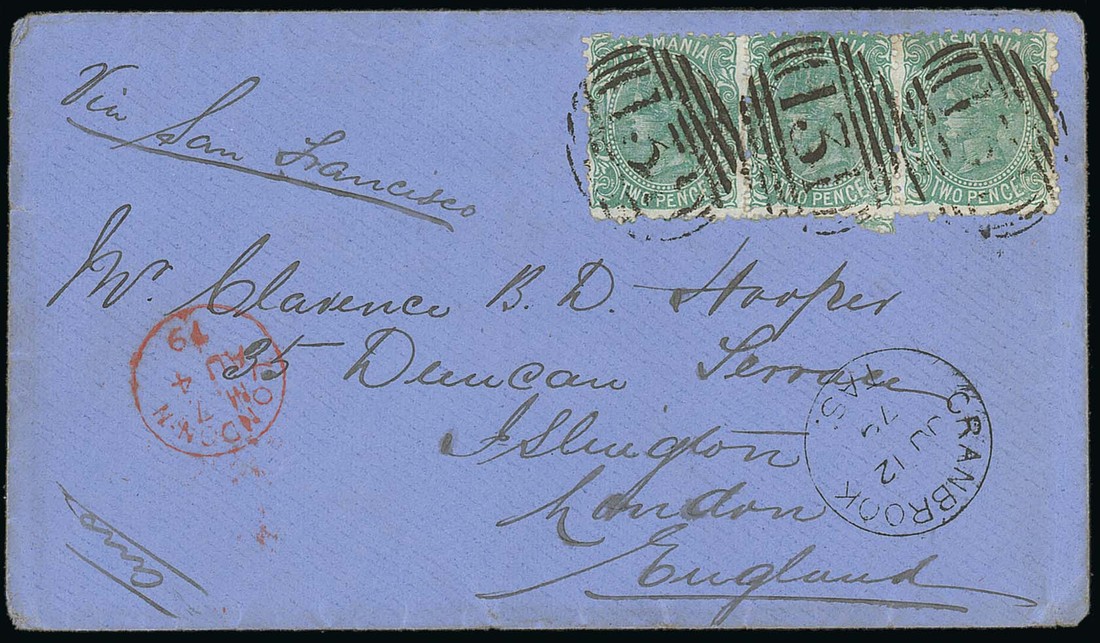 1879 (12 June) envelope to London, marked "Via San Francisco", bearing Sideface 2d. strip of three clearly cancelled by "131" obliterator, showing "cranbrook/tas." c.d.s. and red arrival datestamp. Attractive. Photo