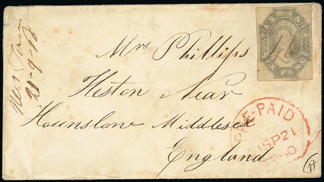 1860 (Sept.) envelope to England, bearing 1860 6d. with central "46", showing manuscript "New Town, 21-9-60" at left and Launceston "pre-paid" transit d.s. in red; a little soiled. Photo