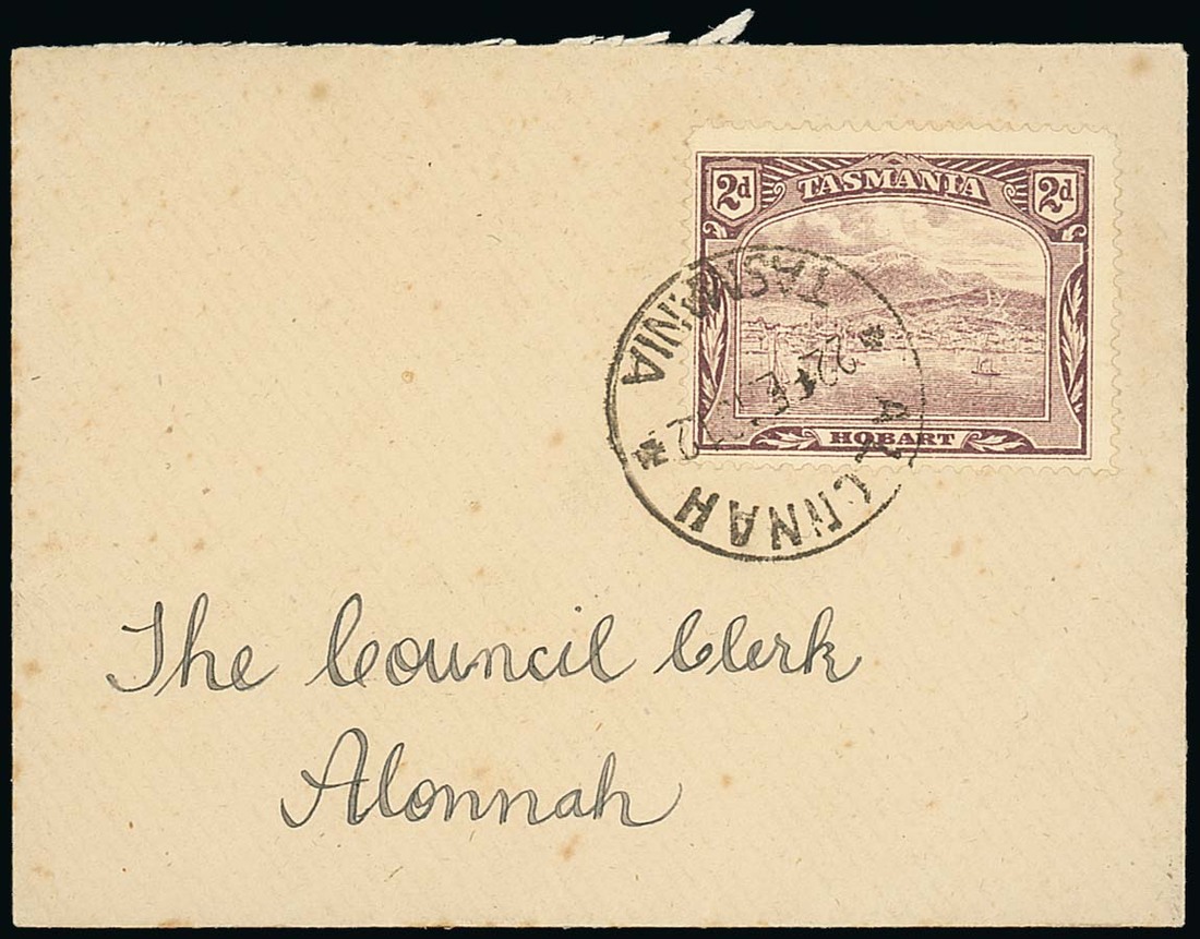 Alonnah: "alonnah/22 fe 1912/tasmania", a fine strike tying Pictorial 2d. on locally addressed envelope showing two further strikes on reverse. Rated RRRR. Photo