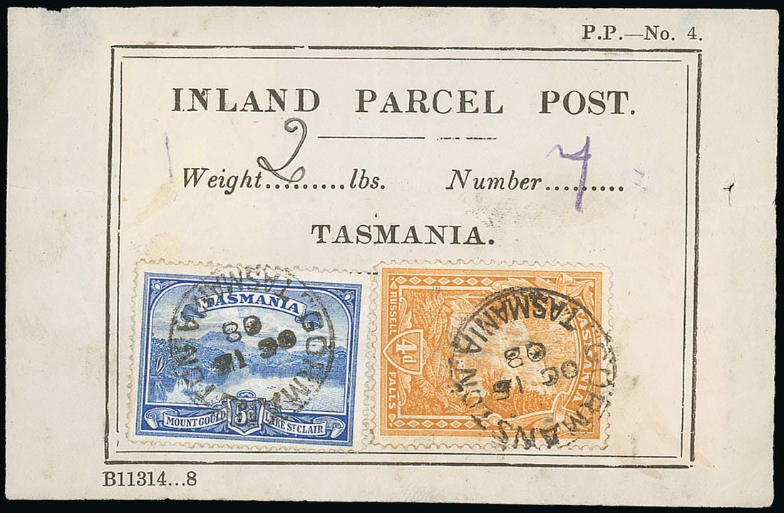 1908 (16 Oct.) Inland label bearing Pictorial 4d. and 5d., both neatly cancelled by "gormanston/tasmania" c.d.s., usual slight creasing. Photo