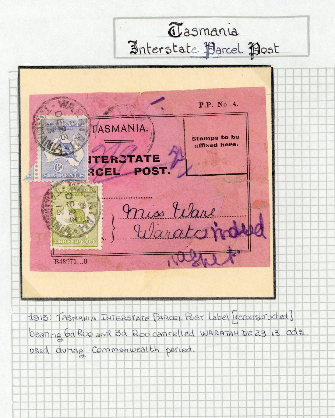 1913 (23 Dec.) Interstate label (reconstructed) bearing Kangaroo 3d. and 6d. tied by "waratah/tasmania" c.d.s.1914 (Apr.) Interstate label (a little damaged) bearing Kangaroo 6d. and 1/- vertical pair, all cancelled by "waratah/tasmania" c.d.s.