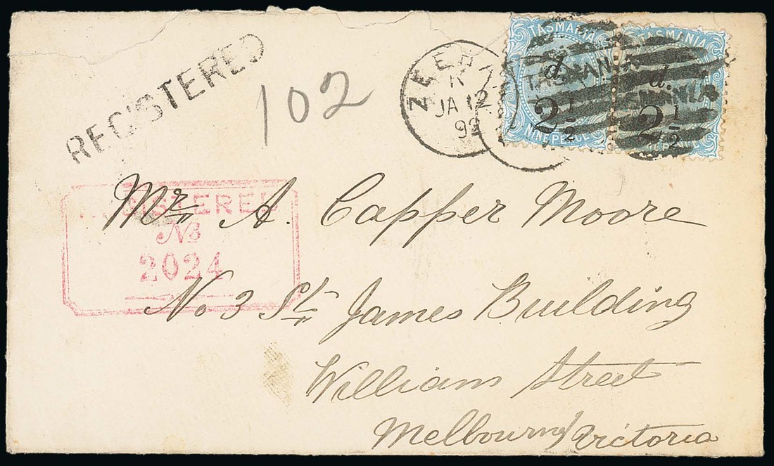 1892 (12 Jan.) envelope registered from Zeehan to Melbourne, bearing 1891 2½d. on 9d. pair tied by slightly heavy duplex, showing straight-line "registered" h.s. and framed "registered" h.s. in red with, on reverse, Hobart transit c.d.s.; the envelope with some tears at top caused through opening. Photo
