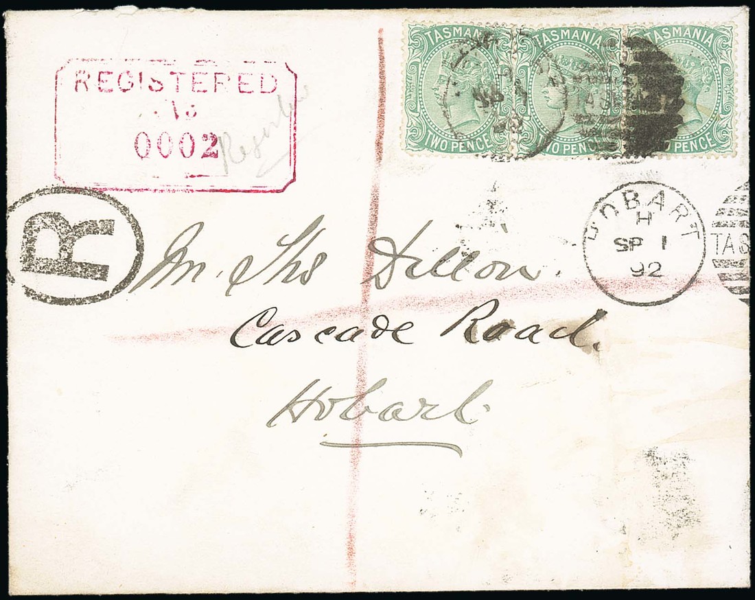 1892 (1 Sept.) locally addressed and registered envelope bearing Sideface 2d. (3), all cancelled by duplex with another clearer part strike, showing "R" in oval and framed "registered" h.s. in red. Photo