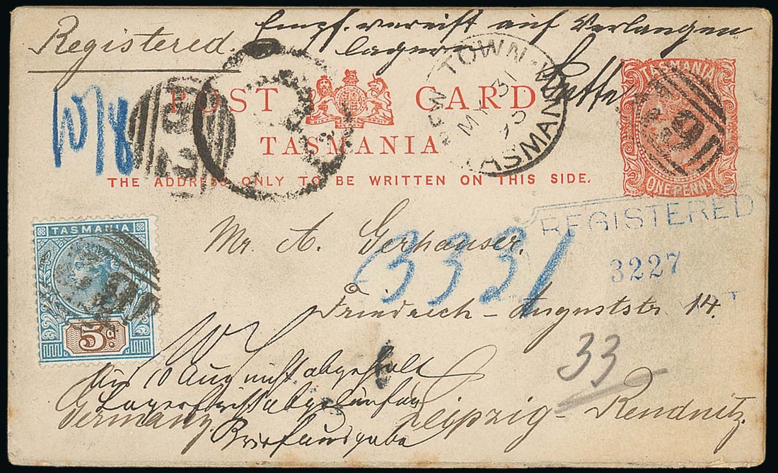 1895 (31 May) 1d. stationery card registered from New Town to Germany uprated with keyplate 5d., both cancelled by "62" obliterator, showing despatch c.d.s., another strike of the "62" obliterator overstruck by "R" in circle and part framed "registered/hobart" h.s. in blue. Neat and attractive. Photo